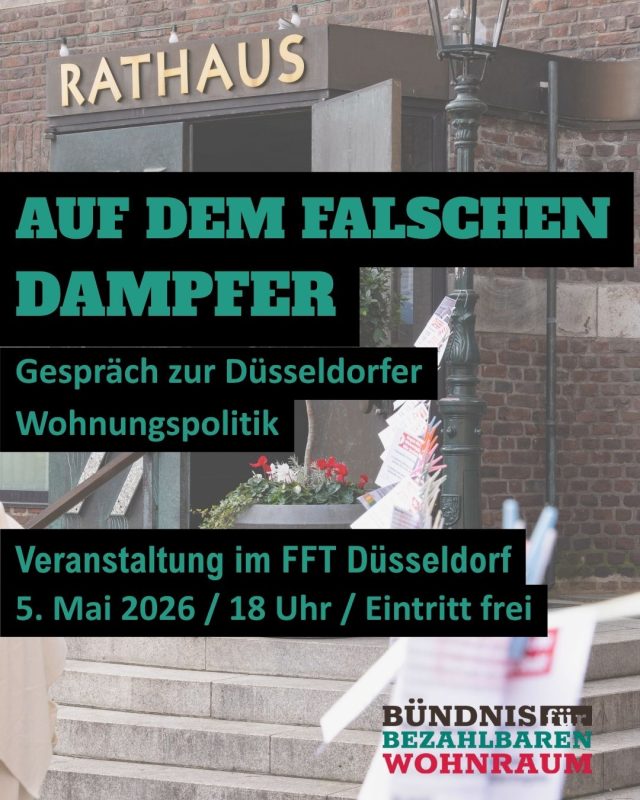 Das Bündnis für bezahlbaren Wohnraum lädt ein zu der Veranstaltung «Du bist nicht machtlos!» Ideen und Strategien gegen den Verkauf von Wohnhäusern an private Investor*innen und gegen den drohenden Verlust der eigenen Wohnung In Düsseldorf passiert es in den letzten Jahren immer wieder: Häuser werden aufgekauft, die Leute mit Mieterhöhungen und Eigenbedarfskündigungen zum Auszug bewegt […]